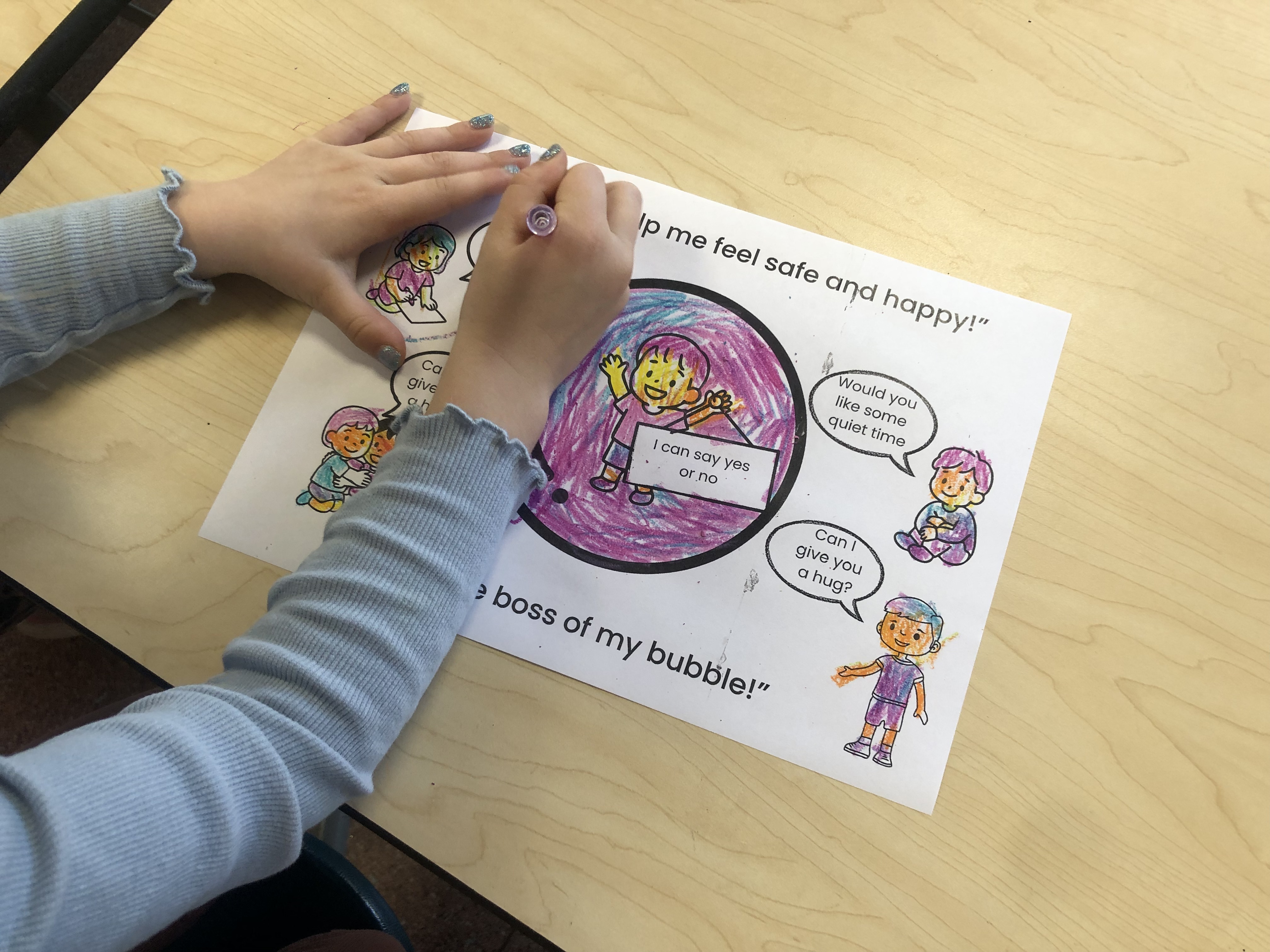 We approached the request for help with energy and creativity and designed a fun session we delivered with the children. We adapted an existing template for different age groups, adding a fun video, and even designing a colouring‑in sheet to bring the concept to life. Through role play, the children practiced asking permission—whether to cuddle, play, or borrow something—and quickly began to understand how important it is to respect each other’s boundaries.